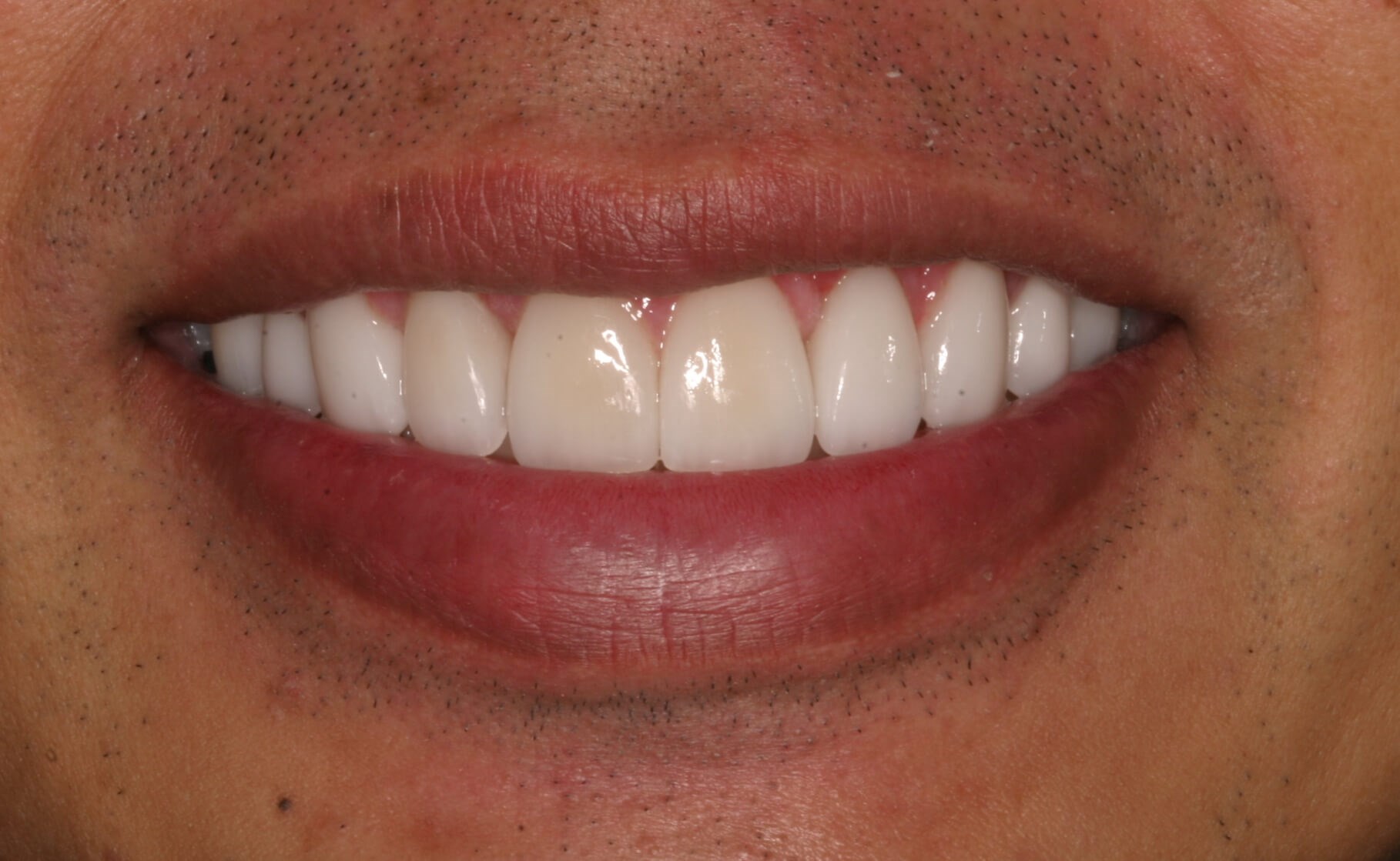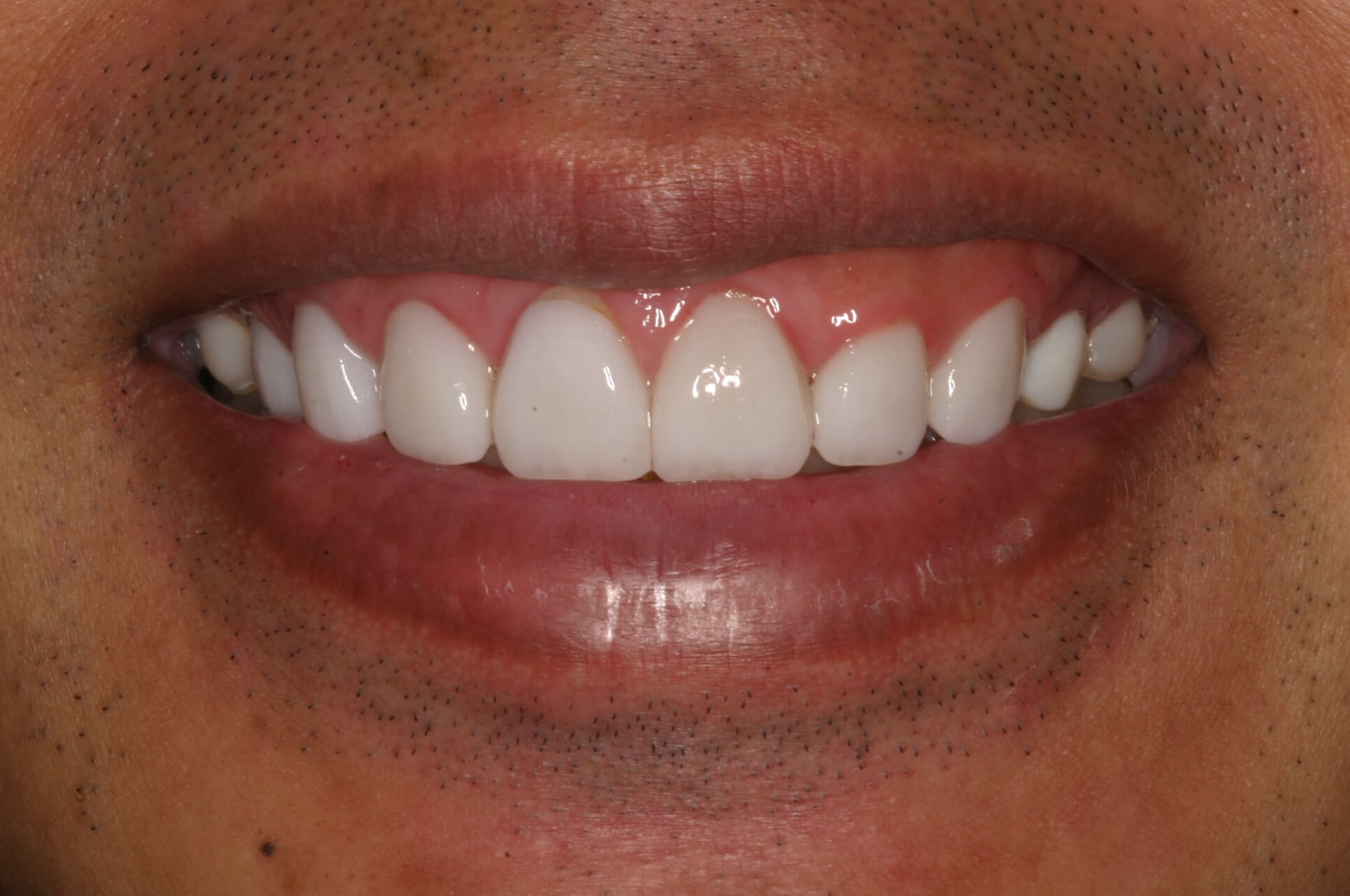 Notice the pink, scalloped gum tissue now follows a graceful and even line along the teeth–with minimal points of gum tissue showing between teeth. Also notice that a more balanced arrangement of teeth now creates a more vibrant smile.